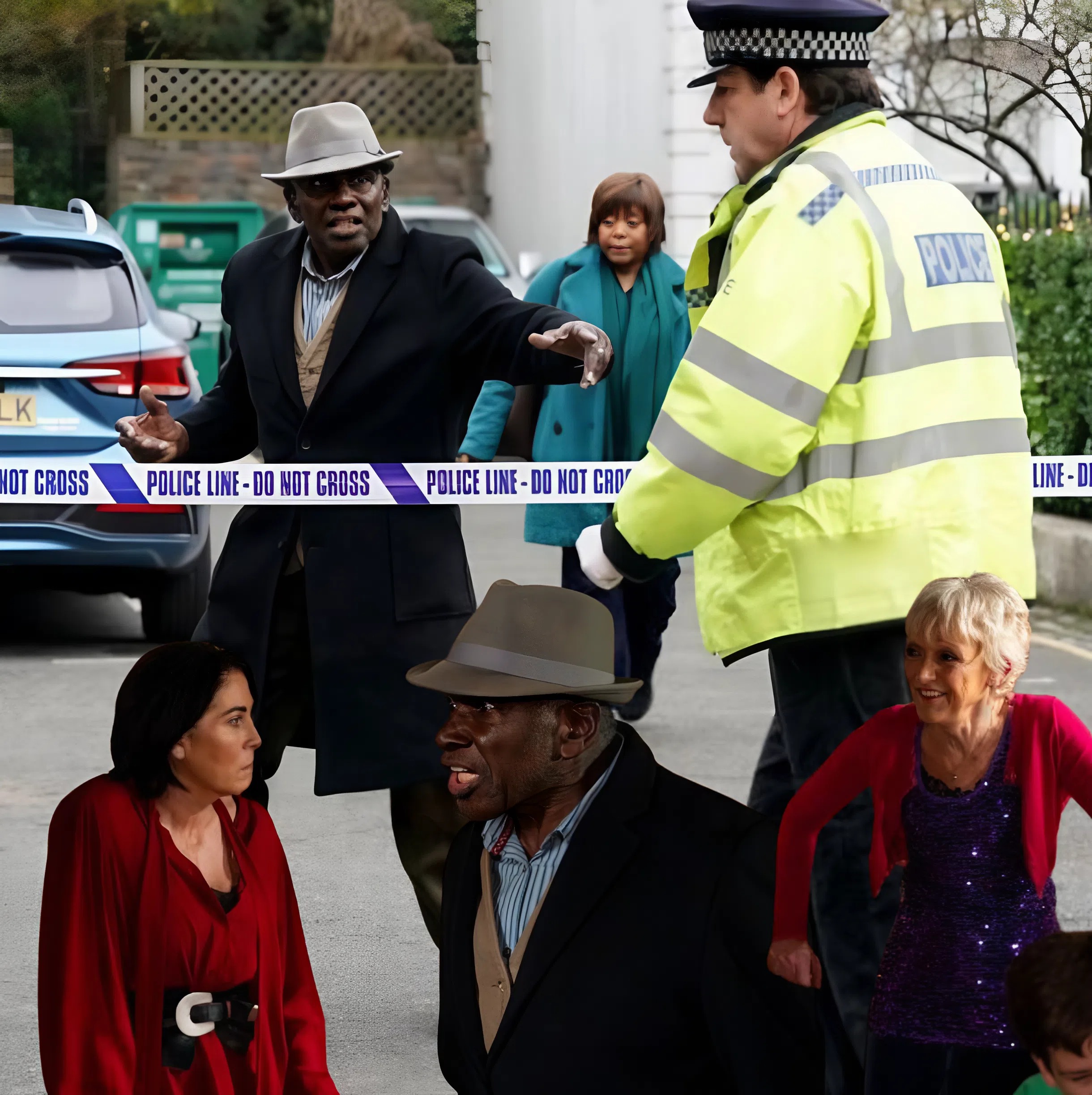 Yolande comforts Patrick as they stand behind police tape on the Square in EastEnders